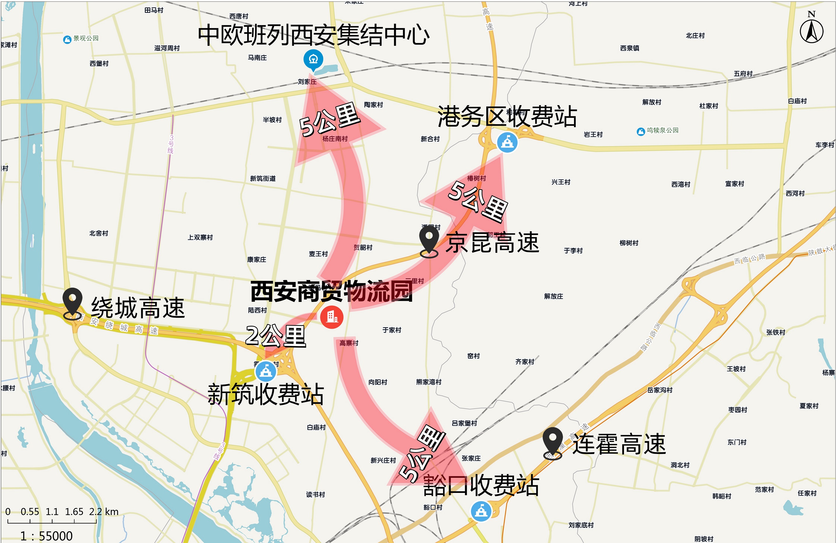 園區(qū)位于浐灞國(guó)際港元朔大道與紡渭路交叉口西北角,距繞城高速新筑收費(fèi)站約2公里,距連霍高速豁口收費(fèi)站、京昆高速港務(wù)收費(fèi)站及中歐班列西安集結(jié)中心均約5公里,出行便捷高效。
