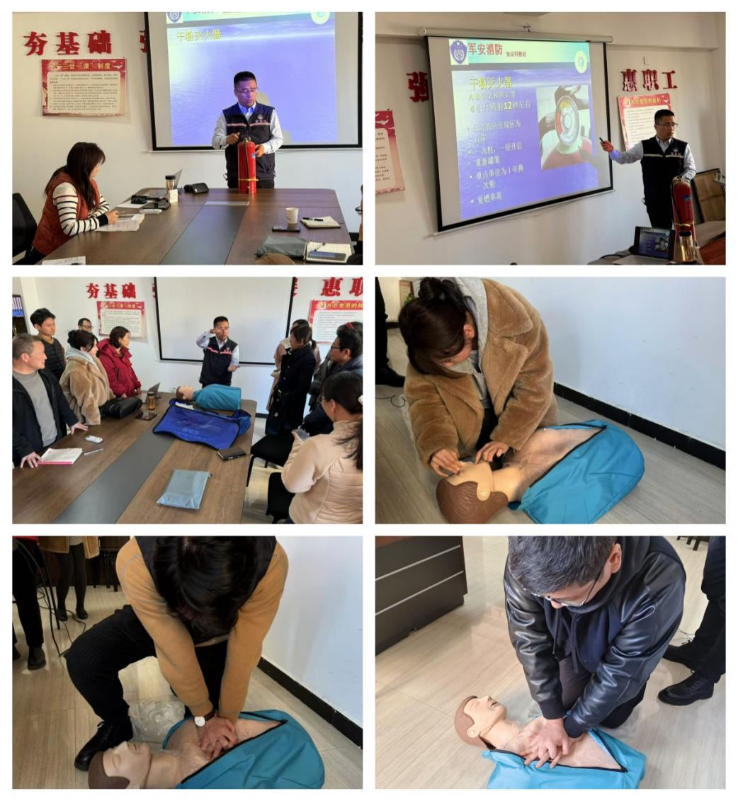 培訓(xùn)會(huì)上,教官通過(guò)“小火亡人”典型事故案例剖析與實(shí)際操作相結(jié)合的方式,全面細(xì)致講解火災(zāi)預(yù)防(如辦公及租賃場(chǎng)所電氣設(shè)備規(guī)范使用、電動(dòng)車電池等易燃物存放要點(diǎn))、火災(zāi)報(bào)警流程及注意事項(xiàng)、各類滅火器材(干粉、水基、氣溶膠滅火器)使用方法演示及實(shí)操練習(xí),以及逃生自救技巧(濕毛巾捂住口鼻或佩戴防煙面具彎腰低姿前行、正確選擇疏散通道)、急救演練等方面內(nèi)容,確保員工在實(shí)操中加深對(duì)消防安全知識(shí)的理解。